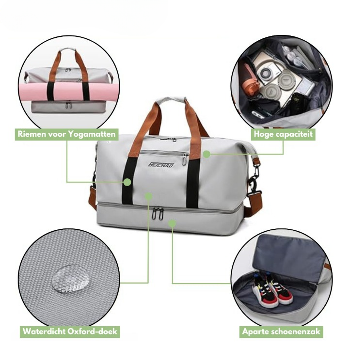 - Gescheiden Schoenen- en Natvak: De tas beschikt over een voorvak met ritssluiting, een binnenvak en nat-droog gescheiden compartimenten, zodat je natte handdoeken en toiletartikelen je andere spullen niet nat maken.